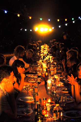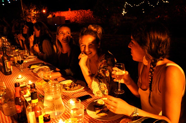 Arriving via a lumpy, bumpy, dusty path in the heart of the island, I arrived to a beautiful orange grove, with a huge clearing strung with coloured lights, surrounded by trees bedecked with twinkling fairy lights and one l-o-n-g, communal table (for 66 people no less!) plonked perfectly in the centre. The red and white gingham tablecloth won me over in seconds, and I half expected the cast of the Sopranos to sit down next to me.