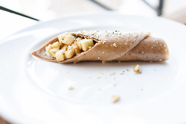 But… was that a chocolate pancake I spied, being served up for breakfast? Not quite so lucky… but it was a raw flax crepe with cashew cream and caramelised cinnamon apple. Surely, something this yummy can’t be healthy? (I am assured that it is so I scoff it down swiftly.)